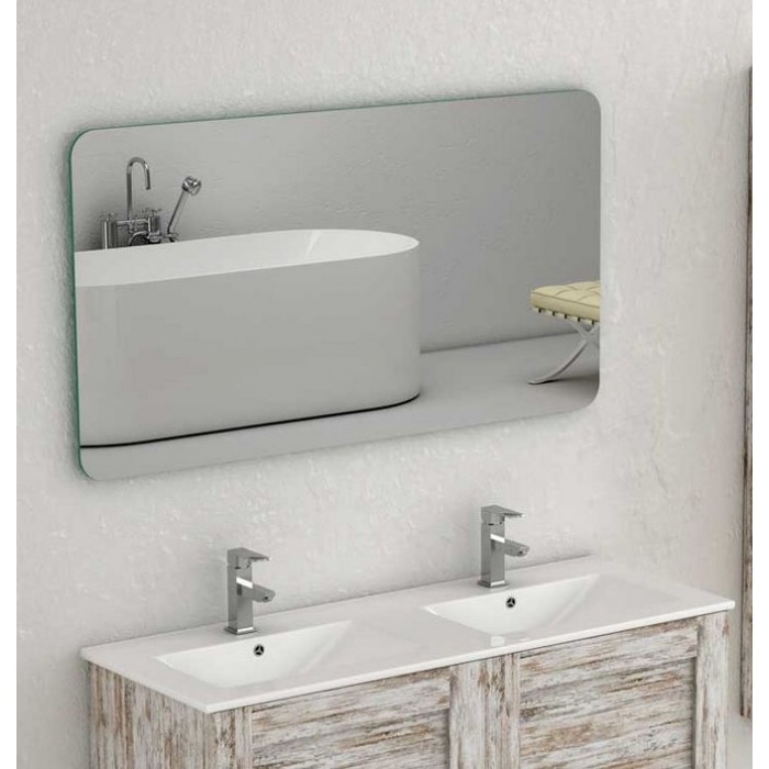 Espejo de esquinas redondeadas. Grosor del cristal: 5mm. Sobre base de tablero de partículas de 16mm. Reversible: No.